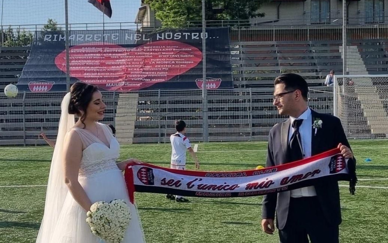Annalisa e Michele, dopo aver celebrato il matrimonio, hanno deciso di spostarsi allo stadio. Come spiega il Sorrento, infatti, il loro primo sguardo se lo sono scambiati dentro l’impianto di via Califano. Di seguito il messaggio del club rossonero. “Annalisa e Michele – freschi sposi cui vanno i nostri migliori auguri – hanno scelto la suggestiva location dello stadio Italia per farsi immortalare subito dopo essere convolati a nozze perché il loro primo sguardo se lo sono scambiati proprio nello stadio di via Califano”.